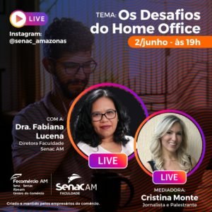 O Serviço Nacional de Aprendizagem Comercial do Amazonas (Senac-AM) inicia na terça-feira (02) o projeto Inovar, que tem por objetivo promover ações de capacitação gratuitas e de curta duração para ajudar os empresários a superarem os desafios da crise provocada pela pandemia da COVID-19. Ao todo, serão oito lives sobre temáticas atuais com especialistas; 20 minicursos com certificados de três a seis horas e 18 cursos de aperfeiçoamento, com aulas remotas que vão oferecer certificação entre 20 e 40 horas. A intermediadora será a jornalista Cristina Monte, que receberá – em cada live – um convidado especial. A primeira live será com a Fabiana Lucena, diretora da Faculdade Senac-AM, que falará, às 19h, sobre o tema “Os desafios do trabalho home Office”. Para participar, é só acessar a plataforma da Sympla (senac-inovar) e fazer a inscrição!