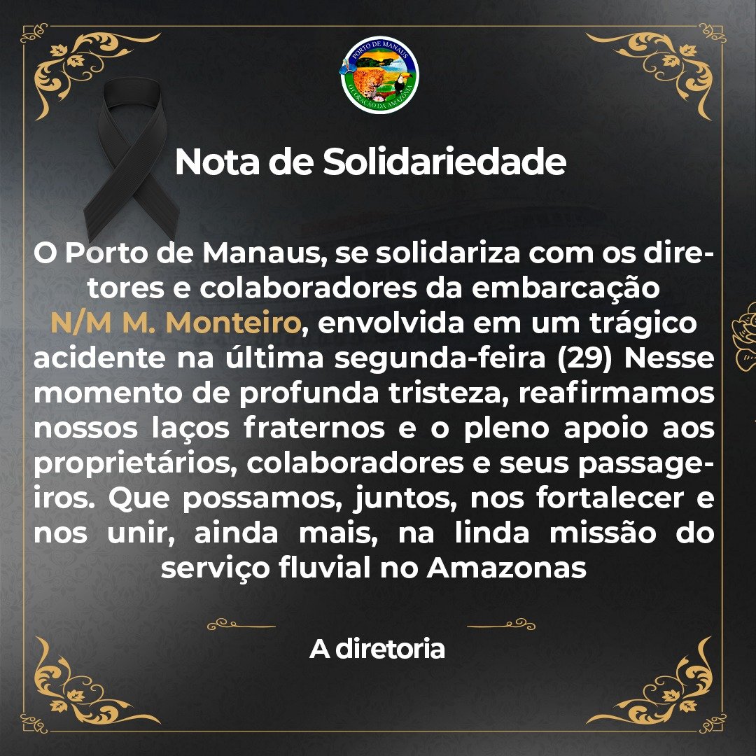 O Porto de Manaus, em nome de sua diretoria, divulgou nesta quinta-feira (01), uma nota de pesar e de solidariedade direcionada aos proprietários e às